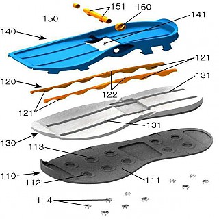 상기 바닥창 본체는 발바닥의 전체 형태에 대응하여 형성되며, [0013] 상기 구동바 이동안내부재는 발바닥의 전체 형태에 대응하는 형태를 가지는 미드솔로서 상기 미드솔의 길이 방향을 따라 구동바 안내 홈부가 형성되며, 상기 구동바는 상기 구동바 안내 홈부를 따라 이동가능하며, 상기 회전축 지지부재는 중앙부에 피니언 수용공간이 형성된 사출판이며, 상기 회전축 부재는 상기 사출판의 피니언 수용공간을 폭방향으로 가로지르면서 배치되며, 상기 피니언 기어부는 상기 피니언 수용공간에 배치되며, 상기 손잡이부는 상기 사출판의 외측에 배치되는 것이 바람직하다.